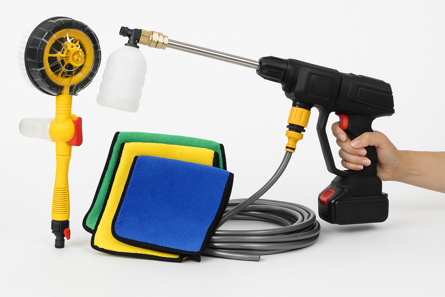 Descoperă pachetul complet pentru curățarea mașinii! Include un aparat de spălat cu presiune portabil, o perie rotativă cu recipient pentru spumă și 3 lavete din microfibră ultra-absorbante. Ideal pentru spălarea eficientă a caroseriei, jantelor și geamurilor. Ușor de utilizat, fără nevoie de conexiune la curent . Perfect pentru acasă sau în deplasare. Curățare rapidă, fără zgârieturi, cu rezultate profesionale!